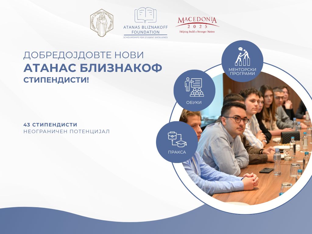 Четириесет и тројца студенти од првиот циклус студии на Универзитетот „Св. Кирил и Методиј“ Скопје се добитници на стипендијата „Атанас Близнакоф„ за студентска извонредност на Македонија2025. Годишно секој студент ќе добие 2,500 американски долари (денарска противвредност) стипендија како поддршка за своите студии. Стипендиите се обезбедени од Фондацијата „Атанас Близнакоф“, како поддршка за новата генерација на академски граѓани.