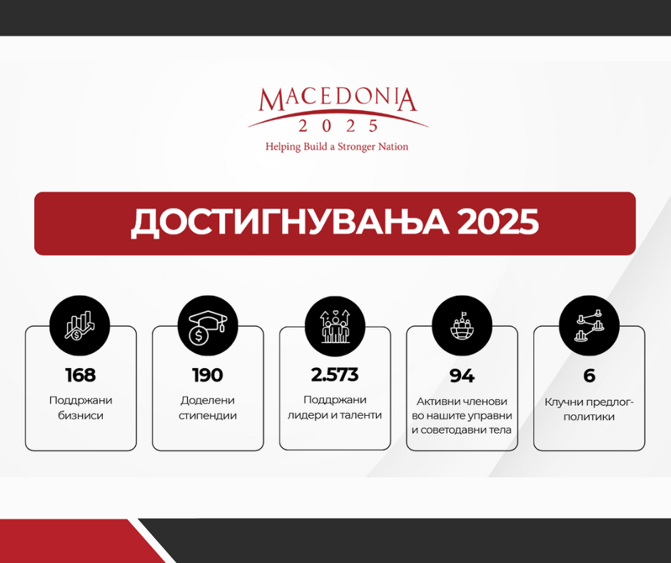 Скопје, 12 декември 2025 – Македонија2025 ги објави резултатите од својата работа во 2025 година, при што организацијата постигна рекордни успеси во поддршката на економскиот развој, лидерството и глобалната поврзаност на земјата. Во 2025 година, Македонија2025 имплементирала, преку повеќе од 40 програми и иницијативи со кои се поддржани 168 компании, доделени се 190 стипендии за едукација и усовршување, а 2.573 лидери и таленти биле директно опфатени со програмите за развој. Организацијата исто така бележи значително зголемување на својот општествен импакт, со 94 активни членови во управните и советодавните тела и развиени шест клучни предлог-политики кои веќе се интегрираат во национални стратегии и реформски процеси.