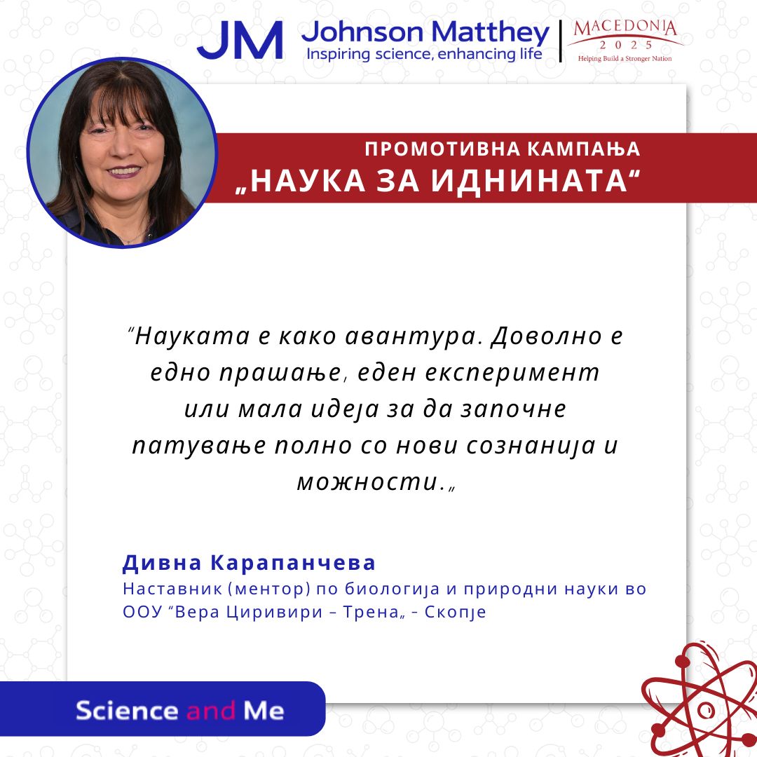 Науката – прозорец кон светот што другите не го гледаат! Во рамките на кампањата „Науката и Јас“, која ја реализираме како дел од програмата за влијание на заедницата на Џонсон Мети, со огромна радост ја споделуваме приказната на Зорка Христова Трајкова – наставник ментор и професор по хемија во ООУ „Крсте Петков Мисирков“ од Радовиш. […]
