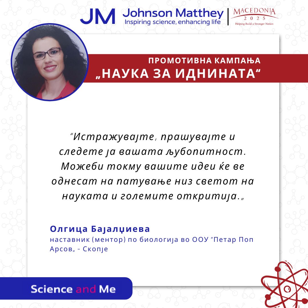 Науката започнува таму каде што љубопитноста добива храброст. Во рамки на кампањата „Наука за иднината“ реализирана со поддршка на Џонсон Мети, ја споделуваме инспиративната приказна на Олгица Бајалџиева, наставник (ментор) по биологија во ООУ “Петар Поп Арсов„ – Скопје. Преку својата мотивациска порака, таа ги охрабрува учениците смело да зачекорат во светот на науката: „Науката […]