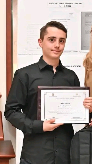 In the past year, Jovan has distinguished himself across multiple fields. He won First Place for best literary essay in the competition organized by the National Bank and the Ministry of Finance to mark World Savings Day. In mathematics, he received the prestigious GaleTeknii Award in honor of Prof. Kiro Galevski for his knowledge and dedication, and also competed at both the National Mathematics Competition and the Regional Informatics Competition.
