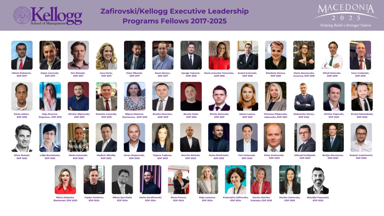 The Zafirovski Executive Education Program of Macedonia2025 in partnership with the Kellogg School of Management (KSM) provides scholarships for Macedonian business leaders to the globally renowned Kellogg Executive Development Program. The program aim is to enhance the competencies and performance of Macedonian business leaders and contribute to the further development of the Macedonian economy and workforce. The program consists of three weeks at the Kellogg School of Management, Northwestern University and additional opportunities for: mentoring, networking and experiential learning. Zafirovski Executive Education Program is offering scholarships for the following two programs: