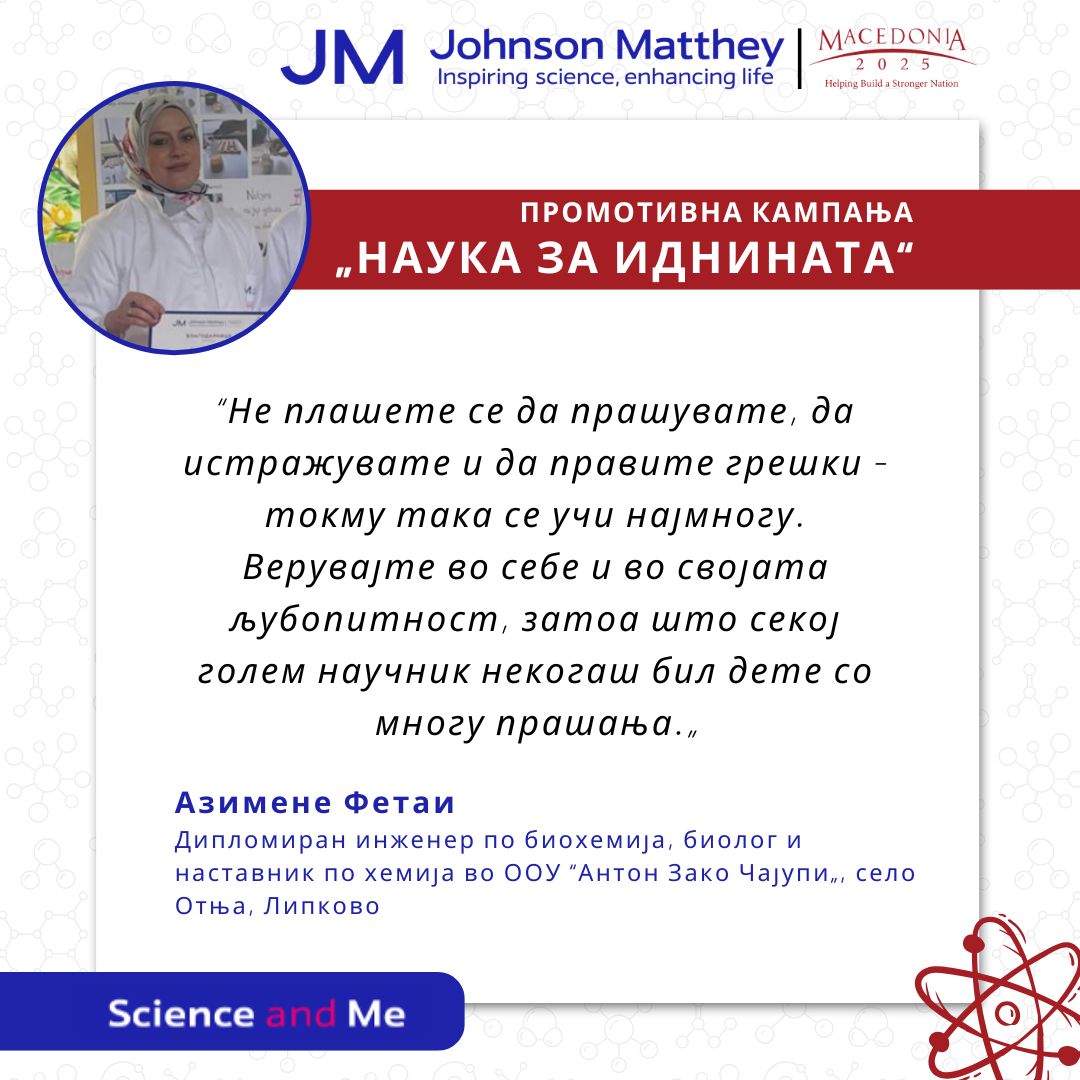 Во рамки на кампањата “Наука за иднината„, реализирана со поддршка на Џонсон Мети Програмата за влијание на заедницата, со особено задоволство ја споделуваме инспиративната приказна на Аземине Фетаи, наставничка во основното училиште “Антон Зако Чајупи„ од село Отња (Липково), дипломиран инженер по биохемија, биолог и наставник по хемија.