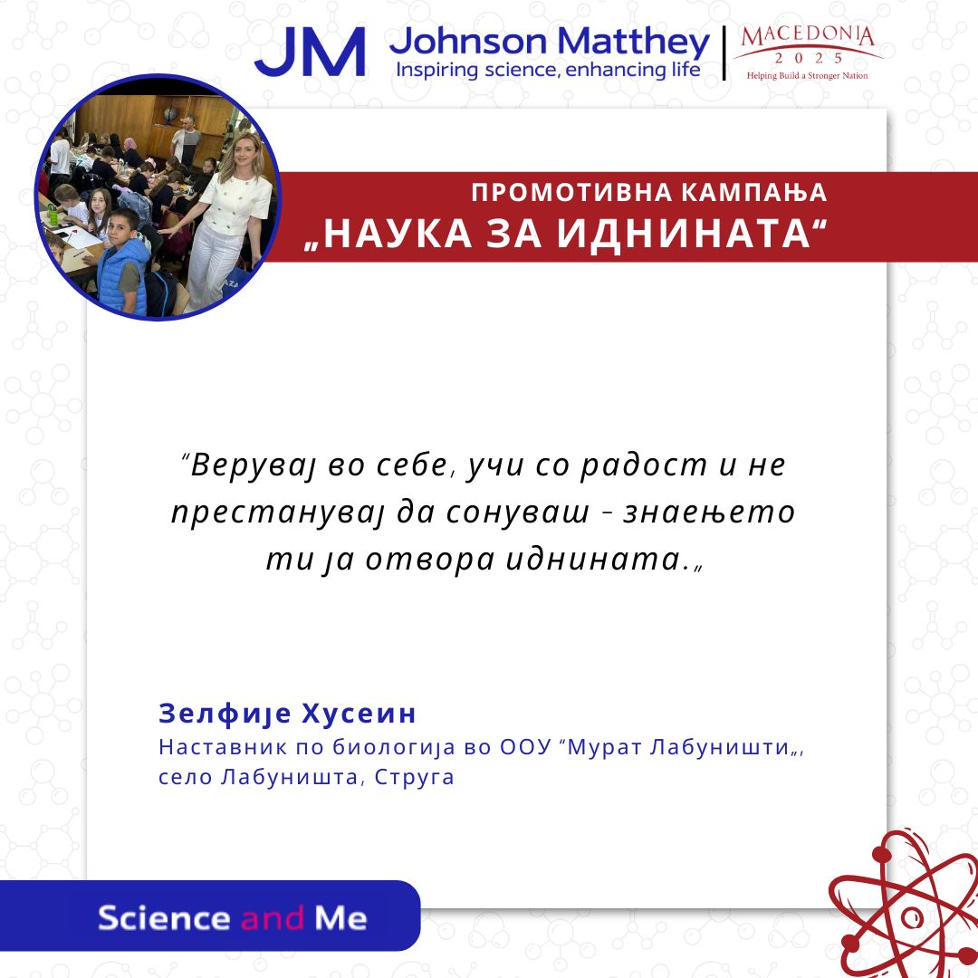 Во рамки на кампањата “Наука за иднината„, реализирана со поддршка на Џонсон Мети Програмата за влијание на заедницата, со големо задоволство ја споделуваме инспиративната приказна на Зелфије Хусеин, наставничка по природни науки и наставник-ментор во ООУ “Петар Здравковски Пенко„ од Скопје.