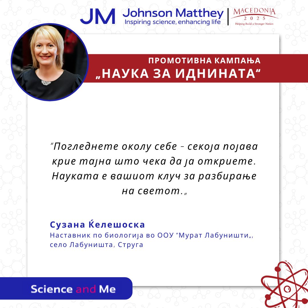 Во рамки на кампањата “Наука за иднината„, реализирана со поддршка на Џонсон Мети, со големо задоволство ја споделуваме инспиративната приказна на Сузана Ќелешоска, наставничка по биологија во ООУ “Мурат Лабуништи„, село Лабуништа, Струга.