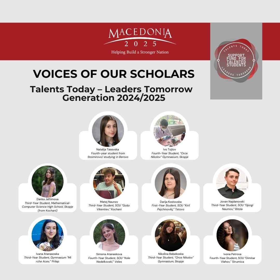 The 2024/2025 generation of the Talents Today – Leaders Tomorrow scholarship fund represents a remarkable group of young individuals whose dedication, talent, and ambition continue to inspire us. Coming from different cities across Macedonia and excelling in diverse fields – from natural sciences and technology to languages, arts, and pharmacy – these scholars have demonstrated not only academic excellence, but also resilience, leadership potential, and a strong sense of social responsibility. Through financial support, structured mentorship, and access to meaningful opportunities, the program has aimed to empower each of them to grow with confidence and clarity about their future paths.