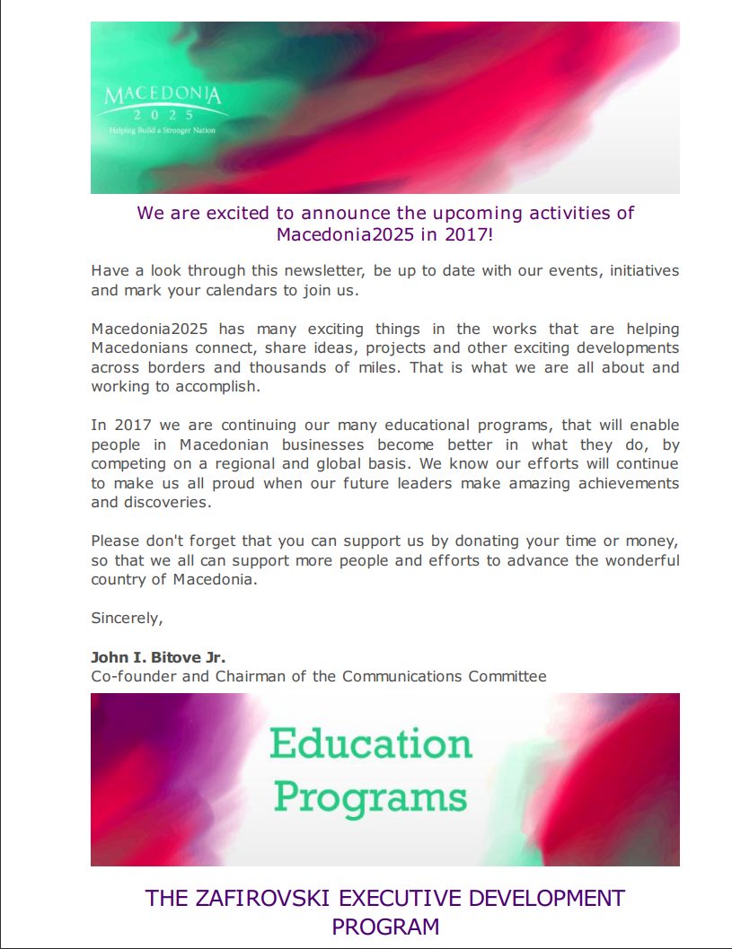 At this point, we would like to thank all our sponsors, members and partners who make this work possible. We will remain dedicated to our main strategic objectives of attracting foreign investments, strengthening the linkages with the professional diaspora, and accelerating leadership development. We will also acquire stronger voice in providing relevant input to the Macedonian policy makers with our cutting-edge research and analysis activities.