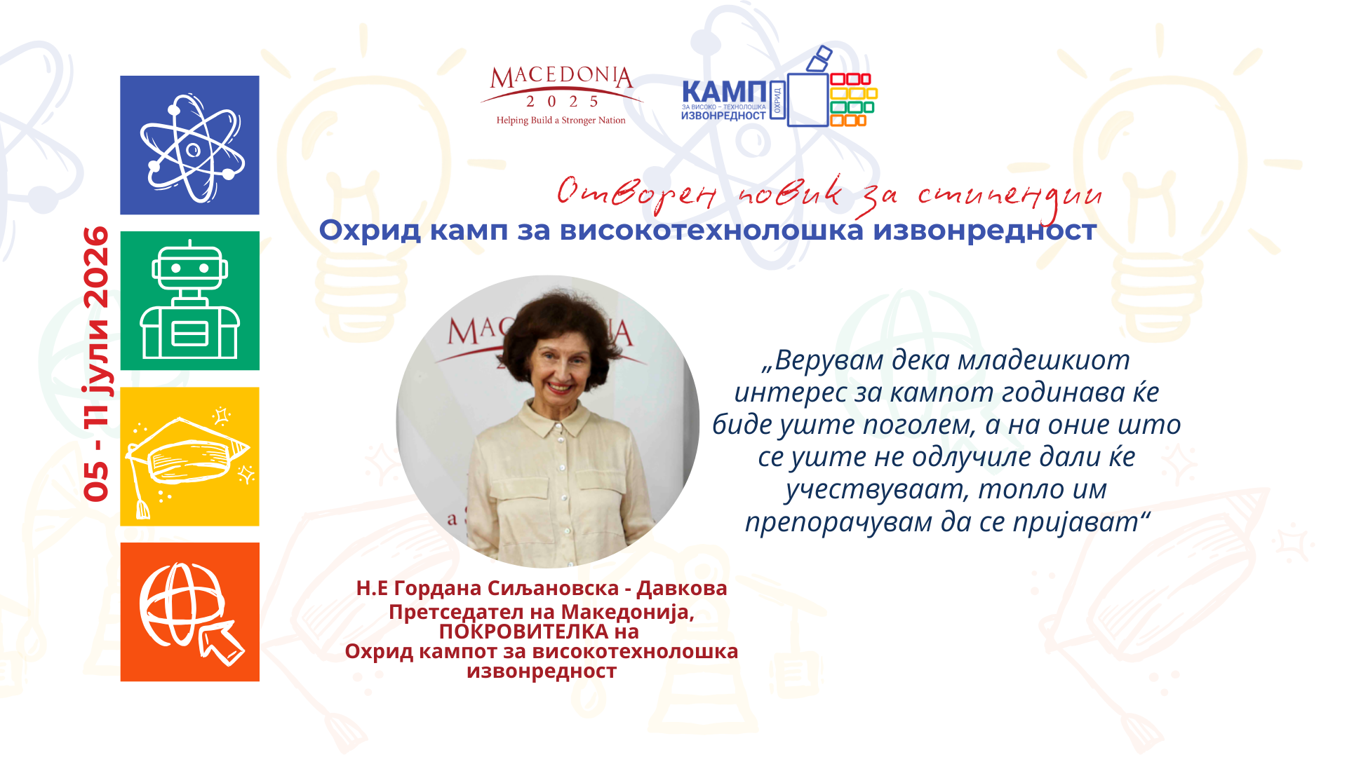 Macedonia2025 is proud to announce that the President of the Republic of Macedonia, Gordana Siljanovska-Davkova, has accepted to place the Ohrid Camp for High-Tech Excellence 2026 under her auspices. The Camp will therefore be held under the auspices of the President of the Republic of Macedonia, reflecting the national importance of investing in youth, technological education, and leadership development. […]